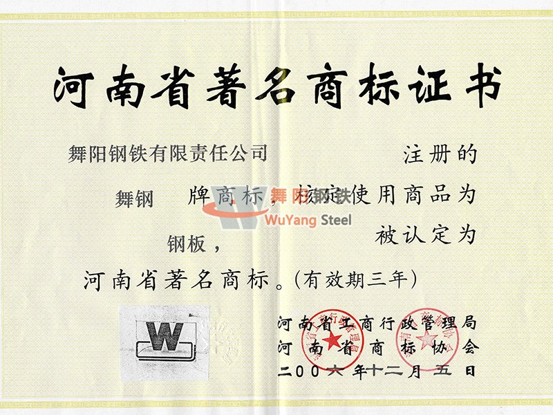 舞陽鋼鐵公司-河南省著名商標稱號
