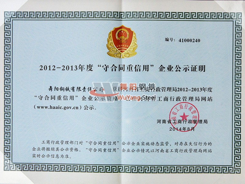舞陽鋼鐵公司-河南省2012—2013年度守合同重信用企業(yè)公示證明