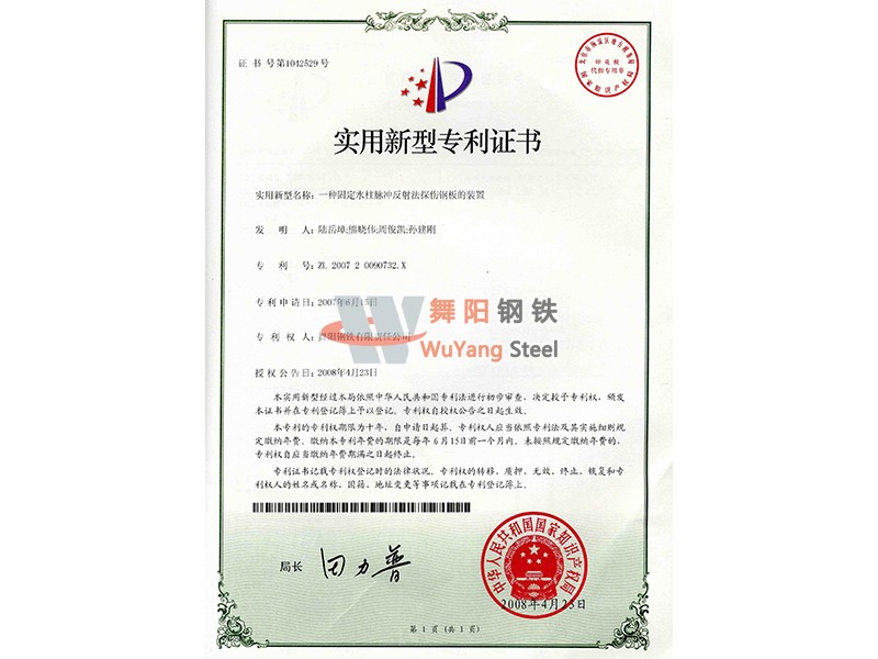 舞陽鋼鐵公司一種固定水柱脈沖反射法探傷鋼板的裝置-實用新型專利證書