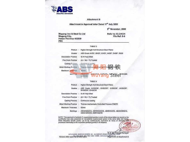 舞陽鋼鐵ABS(美國(guó)) 船舶船級(jí)社認(rèn)證證書
